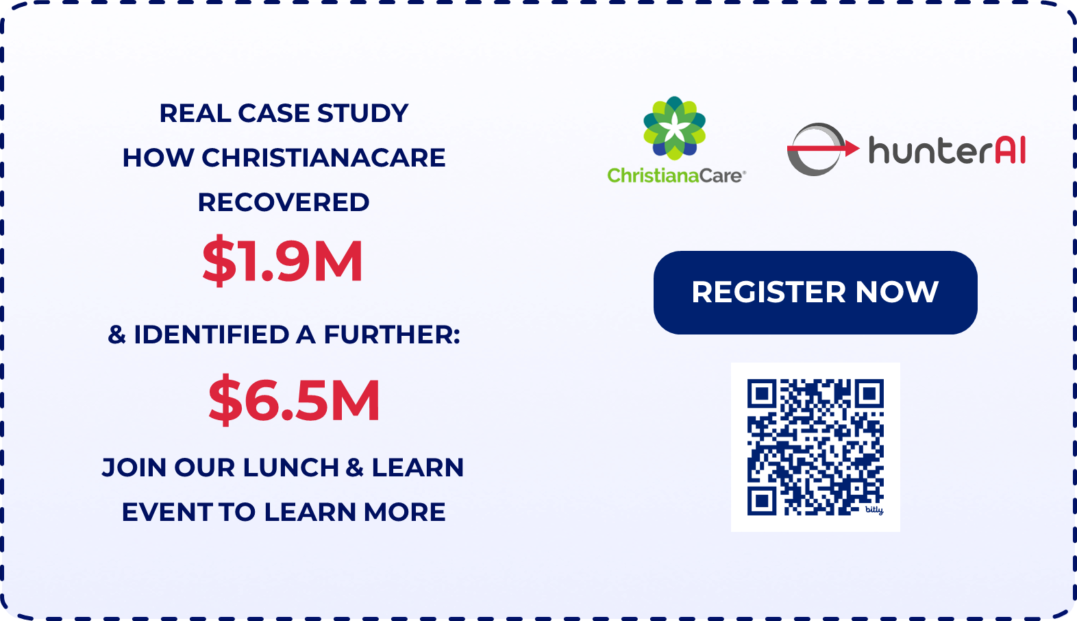 Learn how ChristianaCare is driving improvements with their actionable AI strategy, having partnered with hunterAI (Gartner’s Cool Vendor 2025), $1.9M cash recovered and $6.5M in identified savings being actioned.